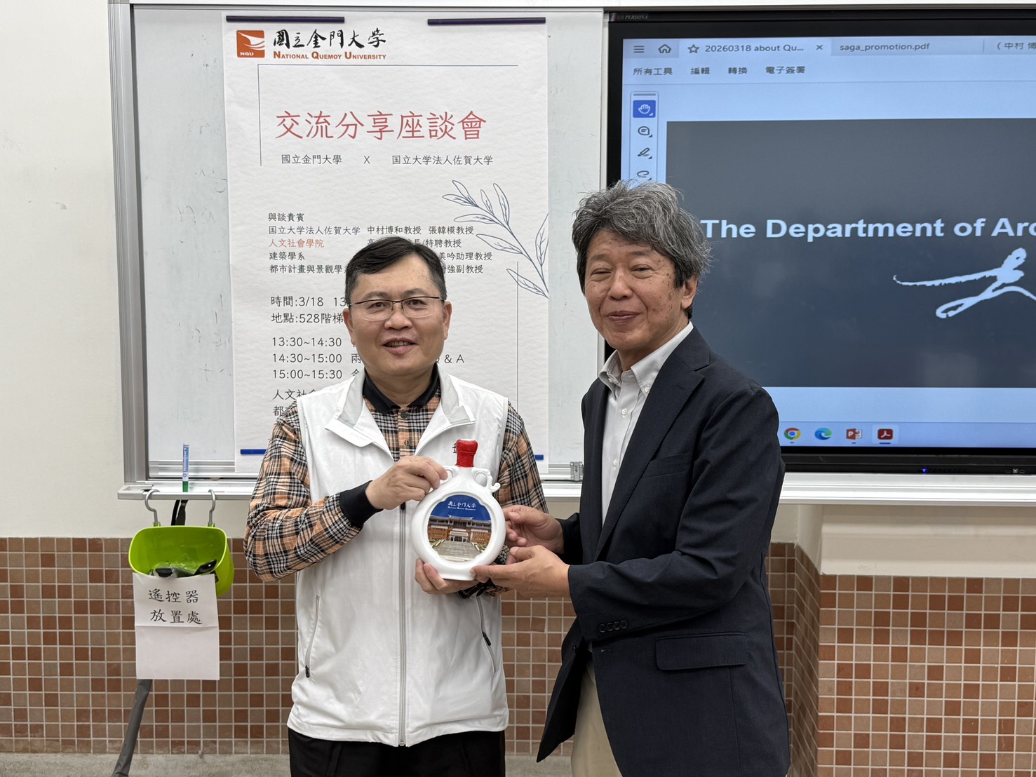 在交流座談的尾聲,雙方學者就如何將經濟學的政策誘因與空間規劃的實務設計進行有效鏈結,展開了熱烈的交叉討論。佐賀大學參訪團對於金門大學能充分利用其特殊的地理區位,連結國家公園、在地傳統聚落與人文歷史資源的「人文生態博物館」模式之課程內容表示讚許。對於台、日面對人口減少與城鄉發展日益失衡的嚴峻挑戰,雙方達成應更積極結合公私部門力量,實踐「越是在地,越是國際」及推動跨域共榮的地方創生理念。最終本次國際交流活動,在雙方互贈紀念品與校園走讀導覽後圓滿落幕;雙方亦將著手後續更具深度與精彩的國際交流活動規劃。